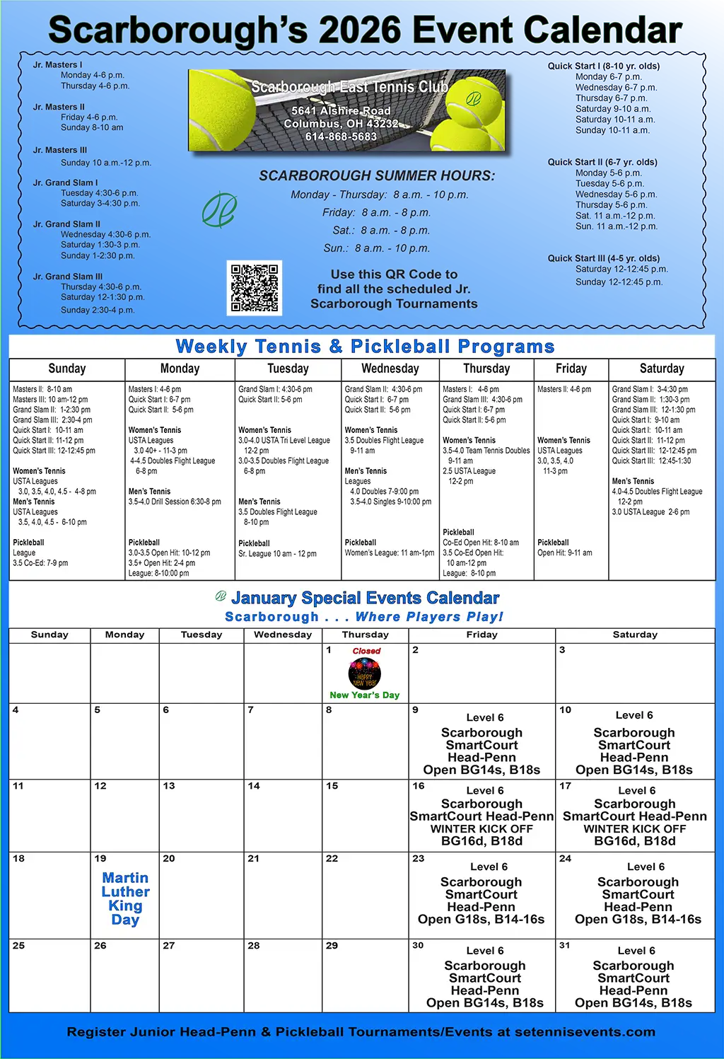 To be eligible, Juniors must participate in at least one summer Junior Program Clinic. Participants will have free use of the following: indoor and outdoor walk-on courts, ball machines, and SmartCourts.